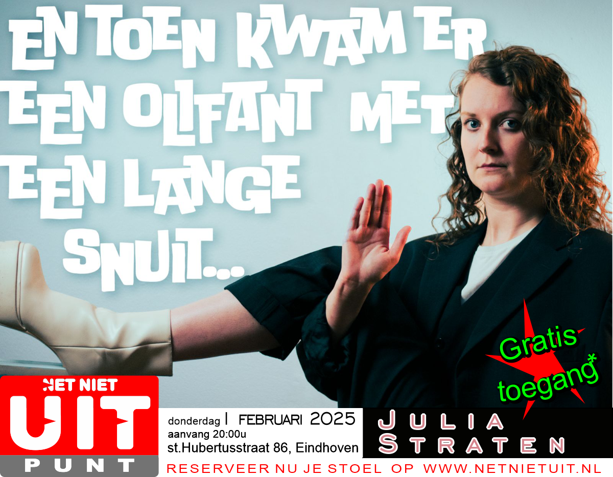 In ‘en toen kwam er een olifant met een lange snuit…’ neemt Julia je mee haar wereld vol verhalen in. Een wereld waarin psychologen, tbs’ers en vliegende varkens je alles eens vanuit een ander perspectief laten zien. Dit aan de hand van liedjes, fysiek theater, poppenspel en uiteraard verhalen.