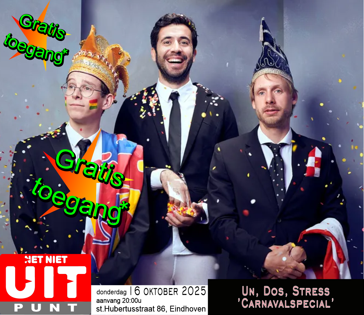 Cabaretformatie Un, Dos, Stress speelt van de 11de van de 11de tot en met carnaval of vastelaovend (net waar je vandaan komt) een totaal absurde, gestoorde en hilarische carnavalscabaretvoorstelling, waarin sketches en scenes elkaar in rap tempo opvolgen. Disclaimer: na het zien van deze voorstelling zal carnaval nooit meer hetzelfde zijn.
