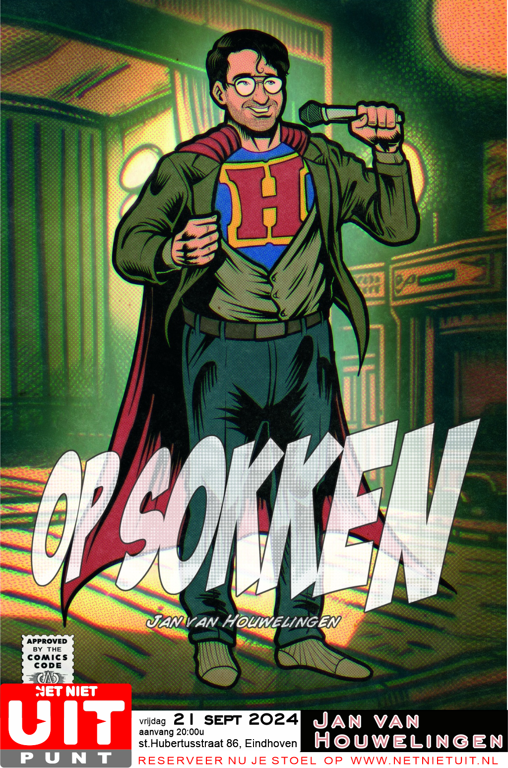 Jan bestijgt nu al een aantal jaar het podium met scherpe anekdotes, ironische woordgrappen en bijziende observaties, maar voor dat laatste heeft hij een bril.
